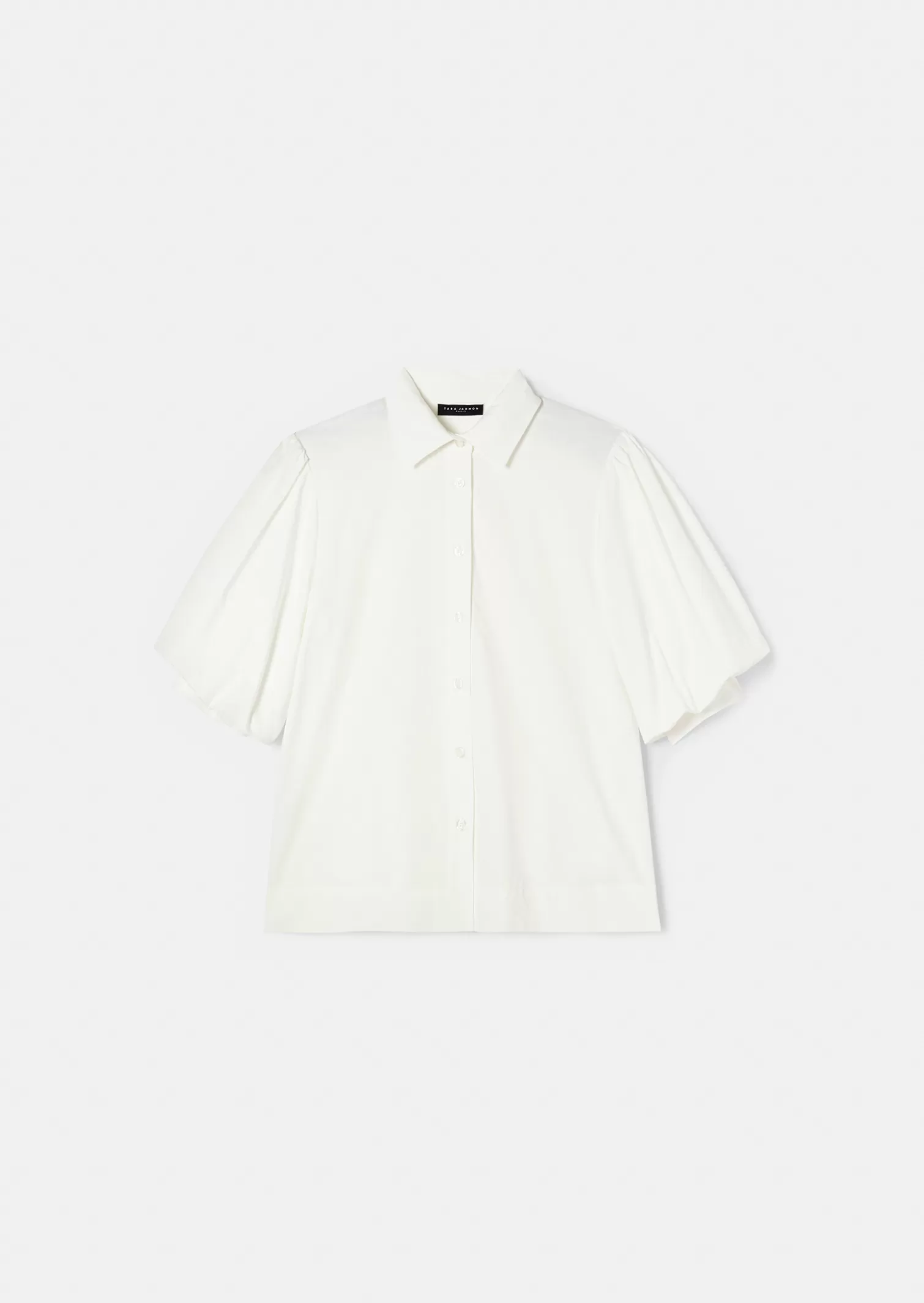 Cette chemise blanche en popeline possède un col chemise et de courtes manches bouffantes. Elle a une coupe légèrement évasée et se ferme au-devant par des petits boutons nacrés que l’on retrouve également aux extrémités des manches.