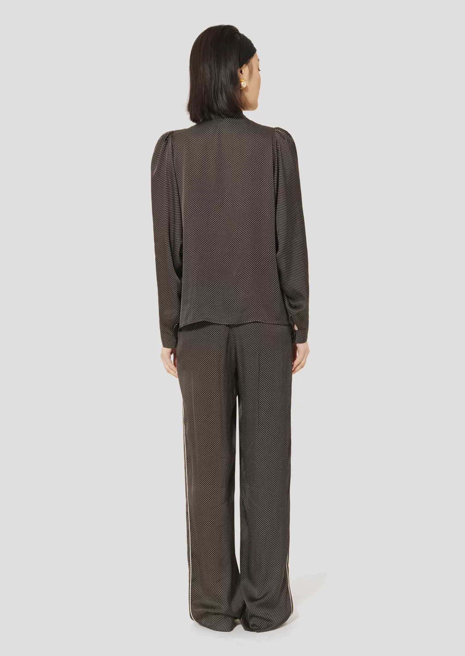 Cette chemise noire imprimée à pois possède des manches longues bouffantes boutonnées aux poignets et un col lavallière non amovible. Elle se boutonne au-devant par de petits boutons ton sur ton. Idéale pour un look ultra élégant et féminin.