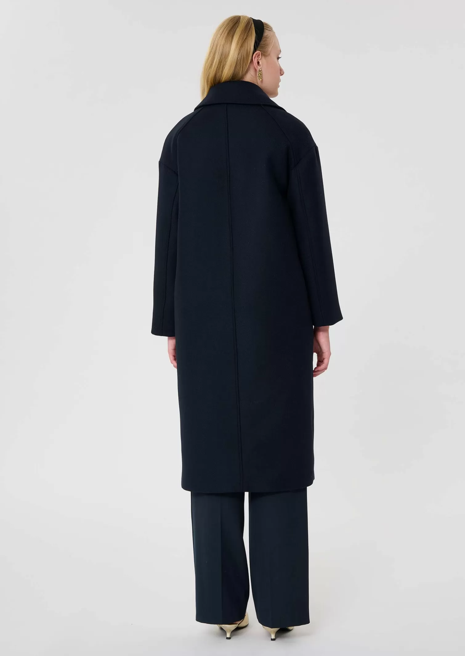 Ce long manteau en laine bleu nuit possède des manches longues, un large col à revers et deux grandes poches aux côtés. Il se ferme au-devant par un simple boutonnage de boutons ton sur ton.
