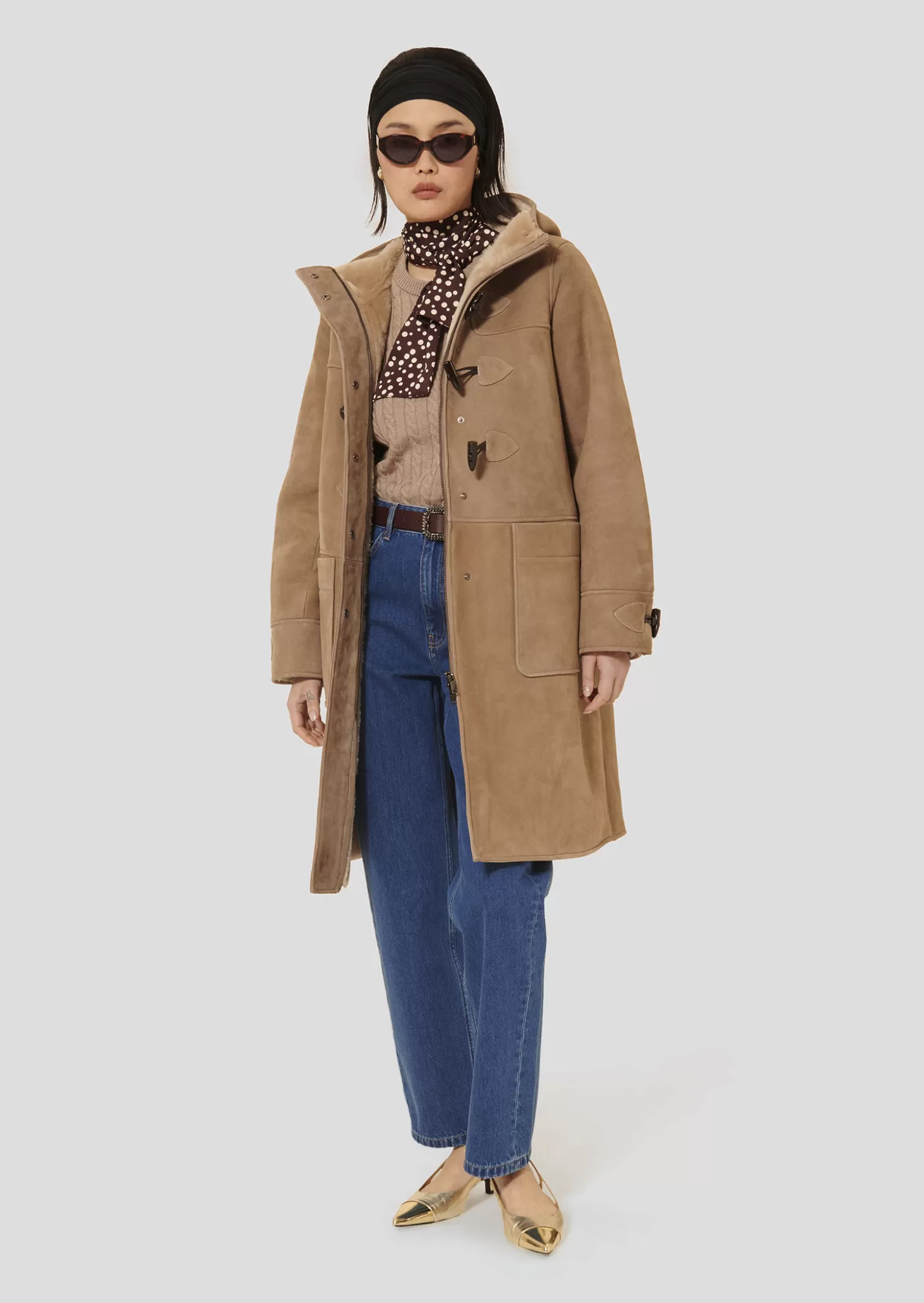 Ce duffle coat couleur noisette possède un col montant, une capuche, des pattes de boutonnages aux poignets et des fermetures brandebourg ainsi que deux grandes poches plaquées aux côtés. Le petit détail : ses attaches en écaille sont décorées de pierres lumineuses. Il se ferme au-devant par un zip et des boutons pressions. La doublure en fourrure fait de ce manteau mi-long votre allié de la saison pour rester au chaud.