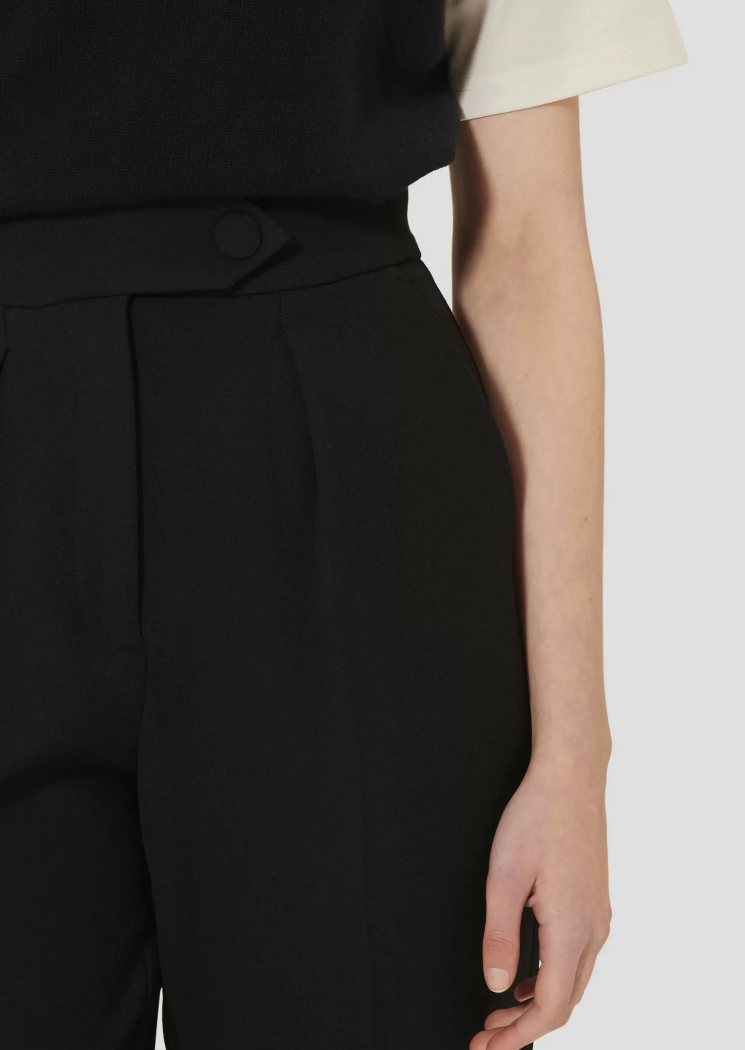 Ce pantalon noir en crêpe possède une coupe droite 7/8, un pli plat et deux larges poches aux côtés ainsi que deux poches passepoilées au dos. Sa ceinture est à bout pointu et il se ferme grâce à un bouton noir recouvert, un zip et une agrafe.