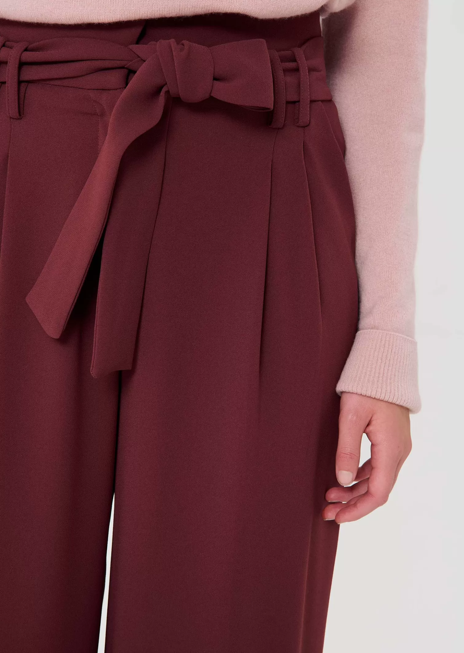 Notre iconique pantalon Pia est de retour en couleur bordeaux cette saison. En crêpe, il possède une jambe large et une taille haute marquée d’une ceinture ton sur ton avec de larges poches aux côtés et des revers au bas pour une allure toujours aussi élégante.