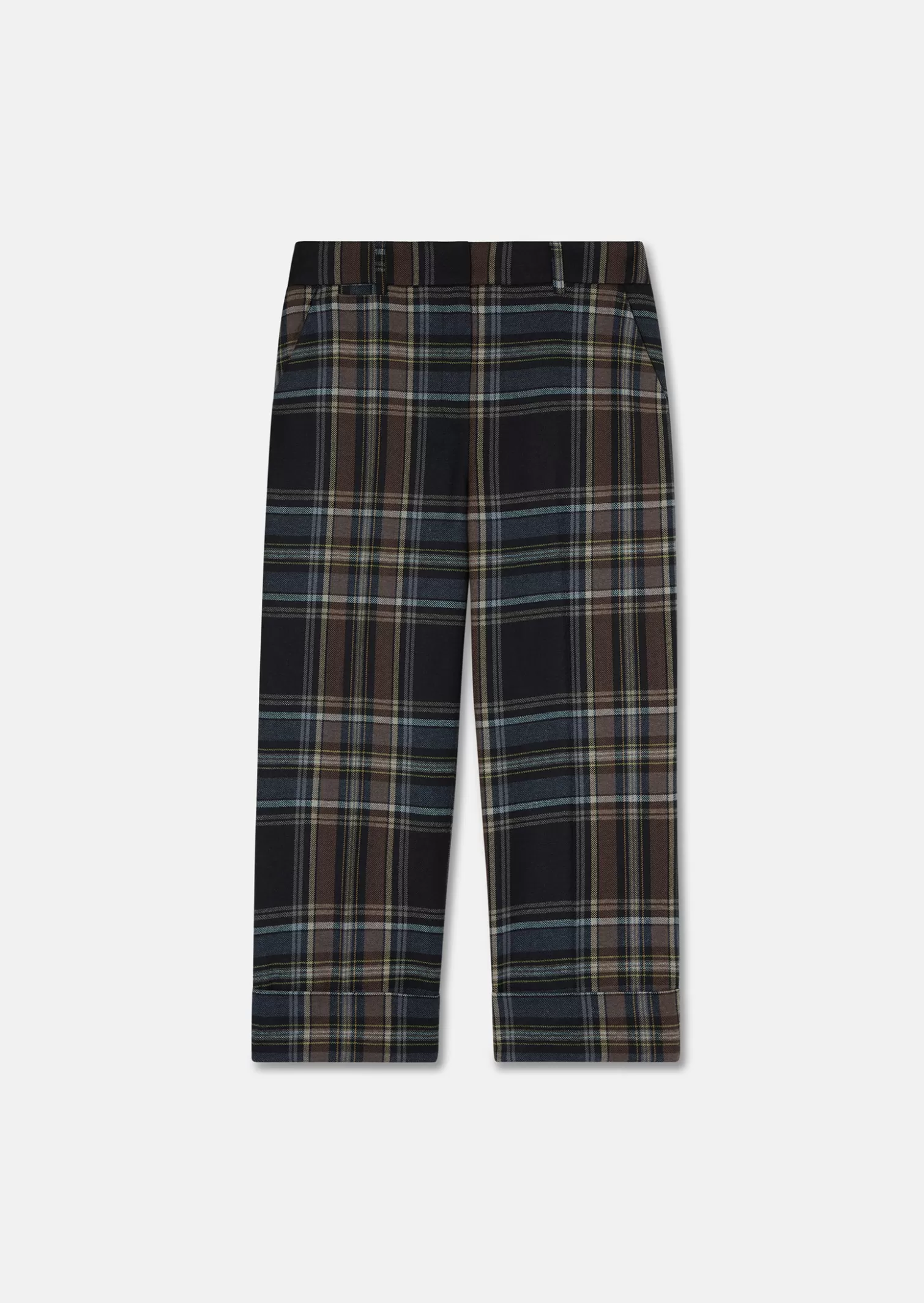 Ce pantalon bleu nuit en tartan anglais possède une coupe 7/8ème, une jambe droite et une taille mi-haute ainsi que des passants pour ceinture. Il a des poches italiennes à l’avant et deux poches passepoilées à l’arrière. Fermeture à l’avant par un zip et une agrafe.