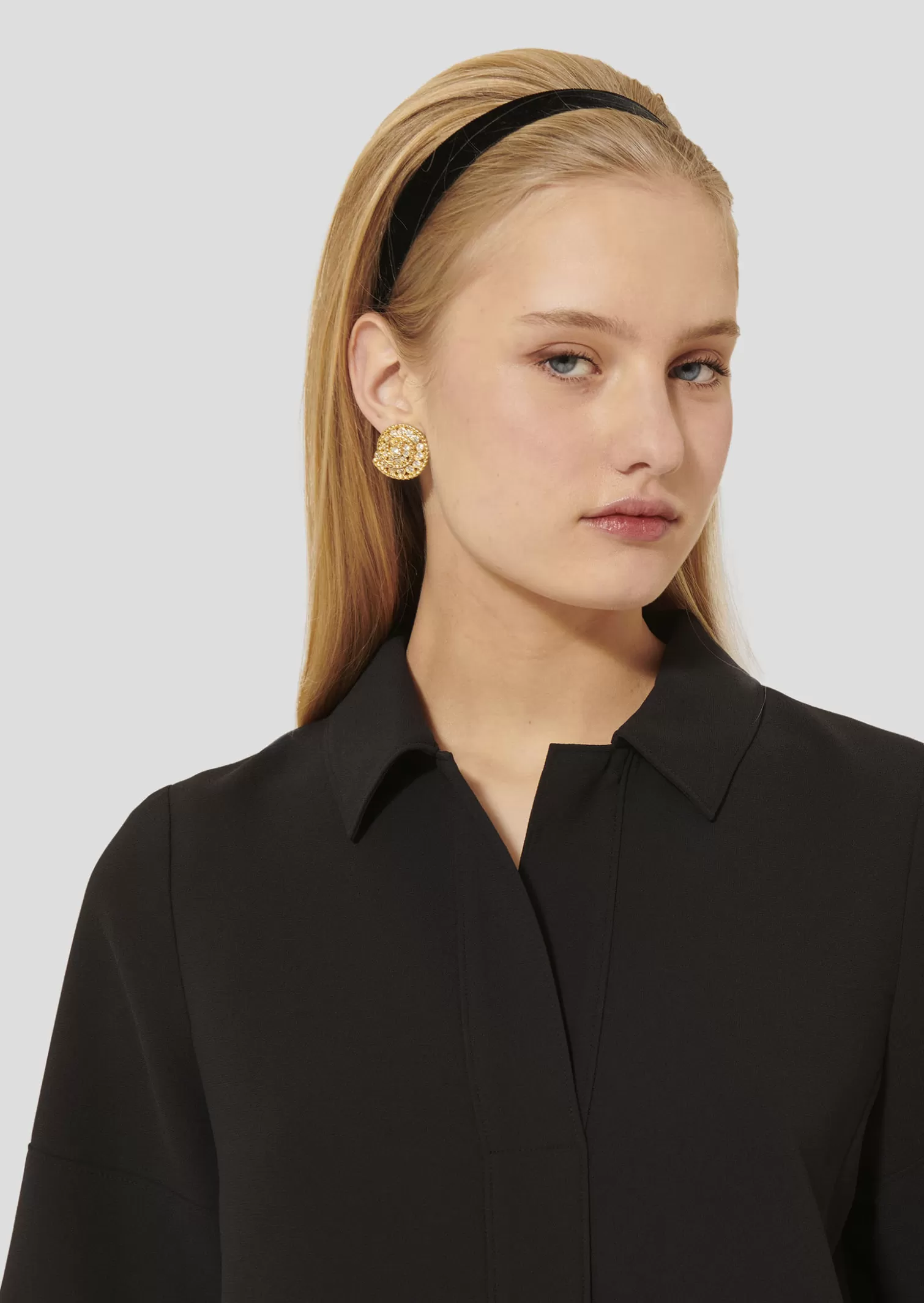 Cette courte robe noire en crêpe possède une coupe légèrement évasée, des manches courtes ainsi qu’un col chemise et une encolure en V.