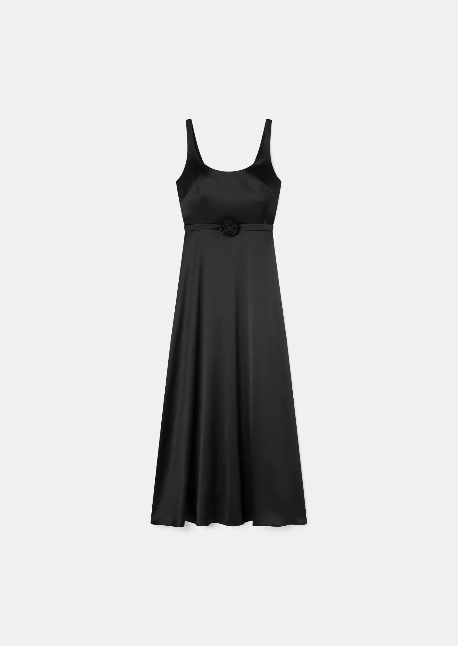 Cette robe noire en satin fluide est sans manches et possède une encolure ronde, une jupe droite et est cintrée à la taille. Elle se ferme par un zip invisible dans le dos. Sa touche Tara réside dans la ceinture amovible sur laquelle est cousue une rose ton sur ton.