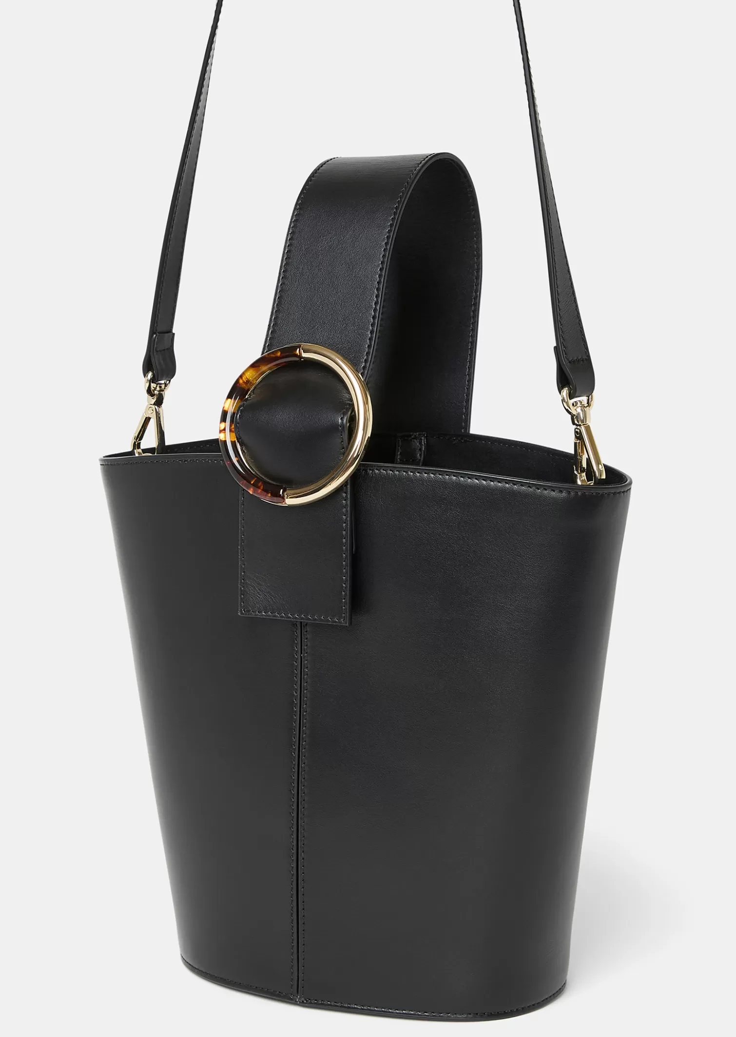 Ce sac seau noir est entièrement conçu en cuir et possède une anse ton sur ton décorée d’une boucle dorée ronde en résine sublimée par un effet écaille de tortue, rapellant notre ceinture Lauren, emblématique de la maison Tara Jarmon. Son format fait de lui le sac idéal pour vous accompagner élégamment au quoitidien.