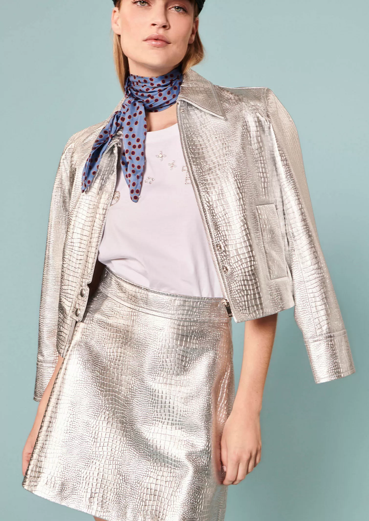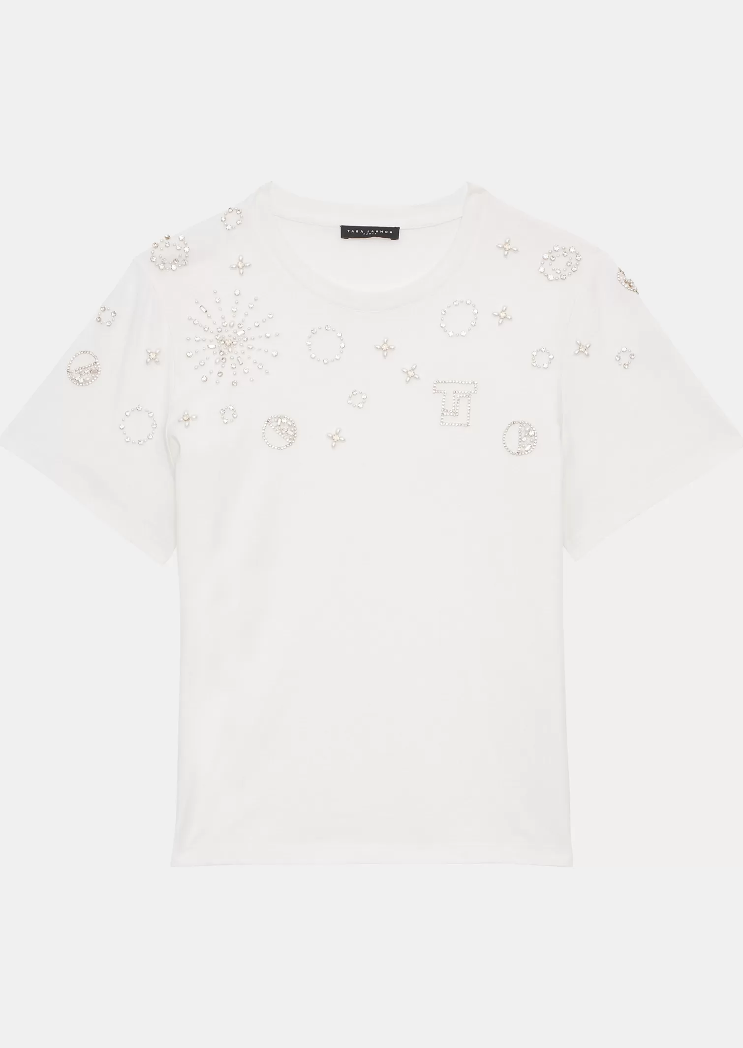 Ce t-shirt blanc en coton possède des manches courtes, un col rond et une coupe droite classique. Il est brodé de strass aux initiales de la maison et de perles au devant, à l’encolure et aux manches.