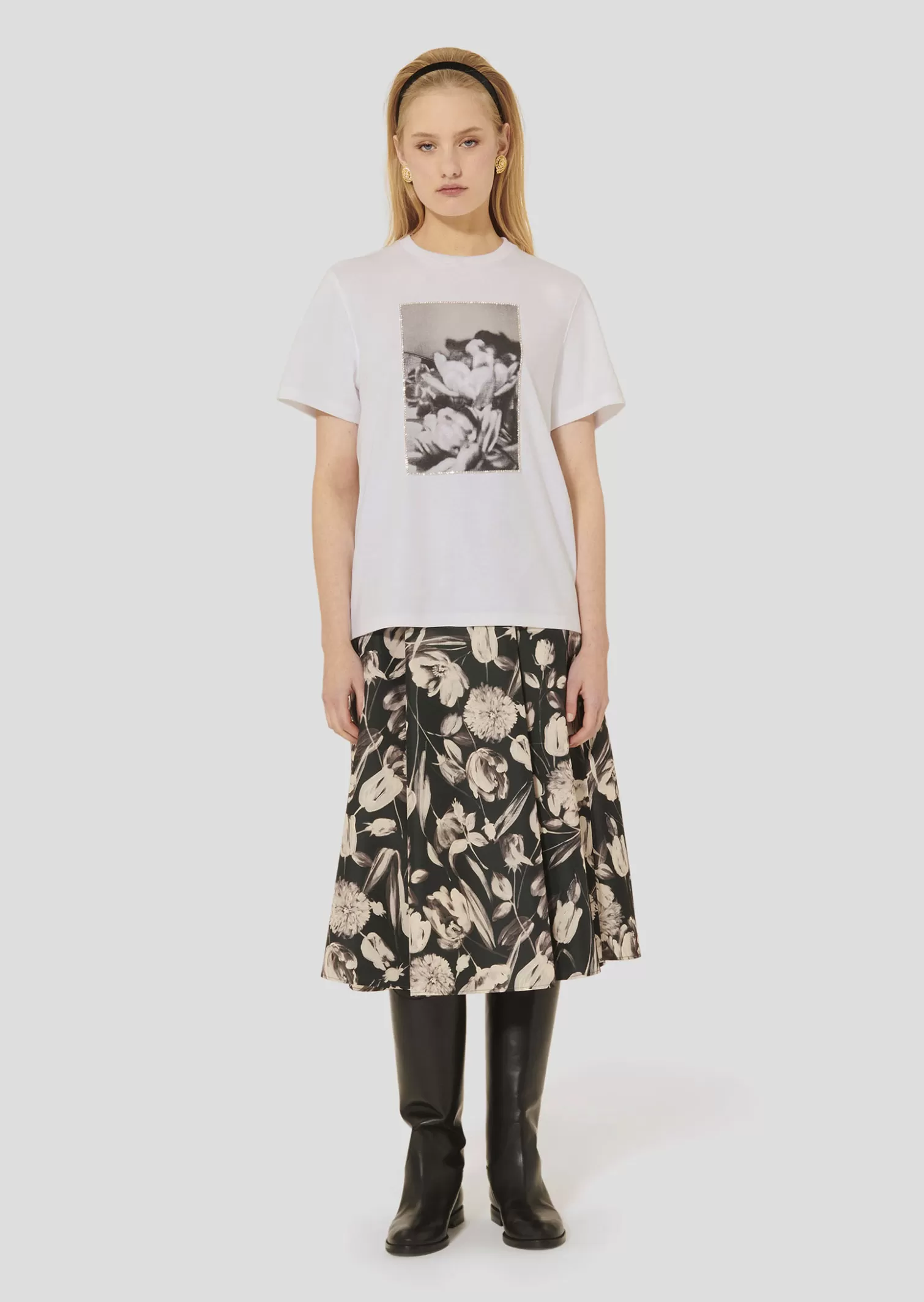 Ce t-shirt blanc en coton possède des manches courtes, un col rond et une coupe droite classique. Son twist, so Tara, est apporté par une illustration fleurie en noir et blanc, encadrée de strass.